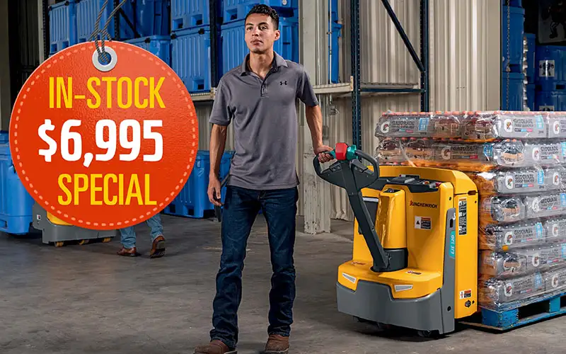 Easy operation with the handle in the vertical position using the Crawl Speed button simplifies movement inside trailers and in confined spaces.