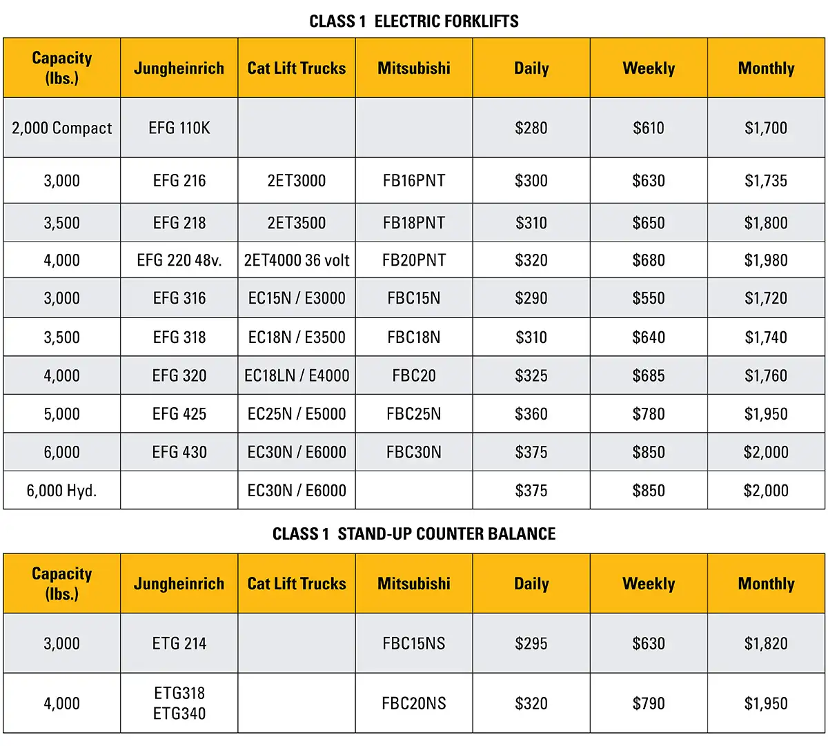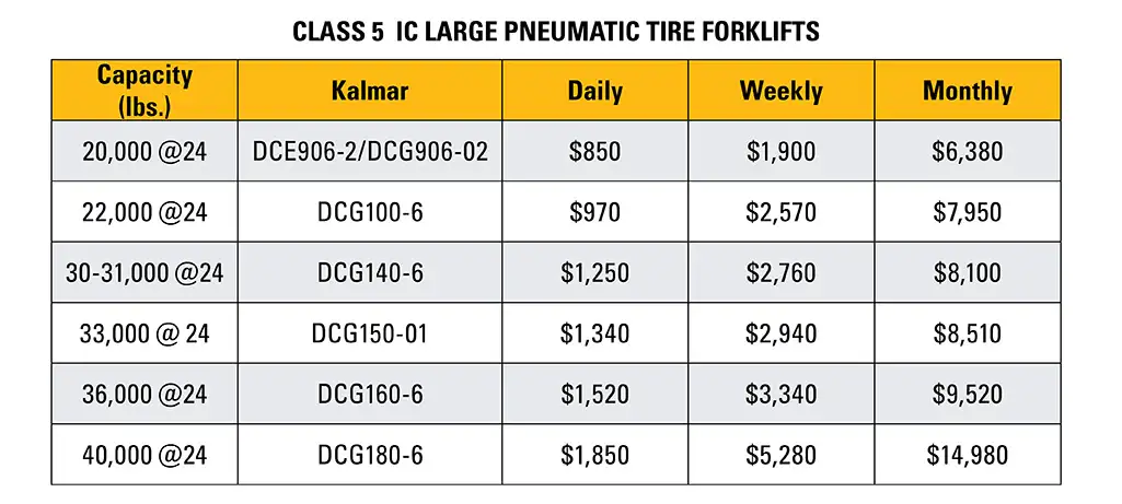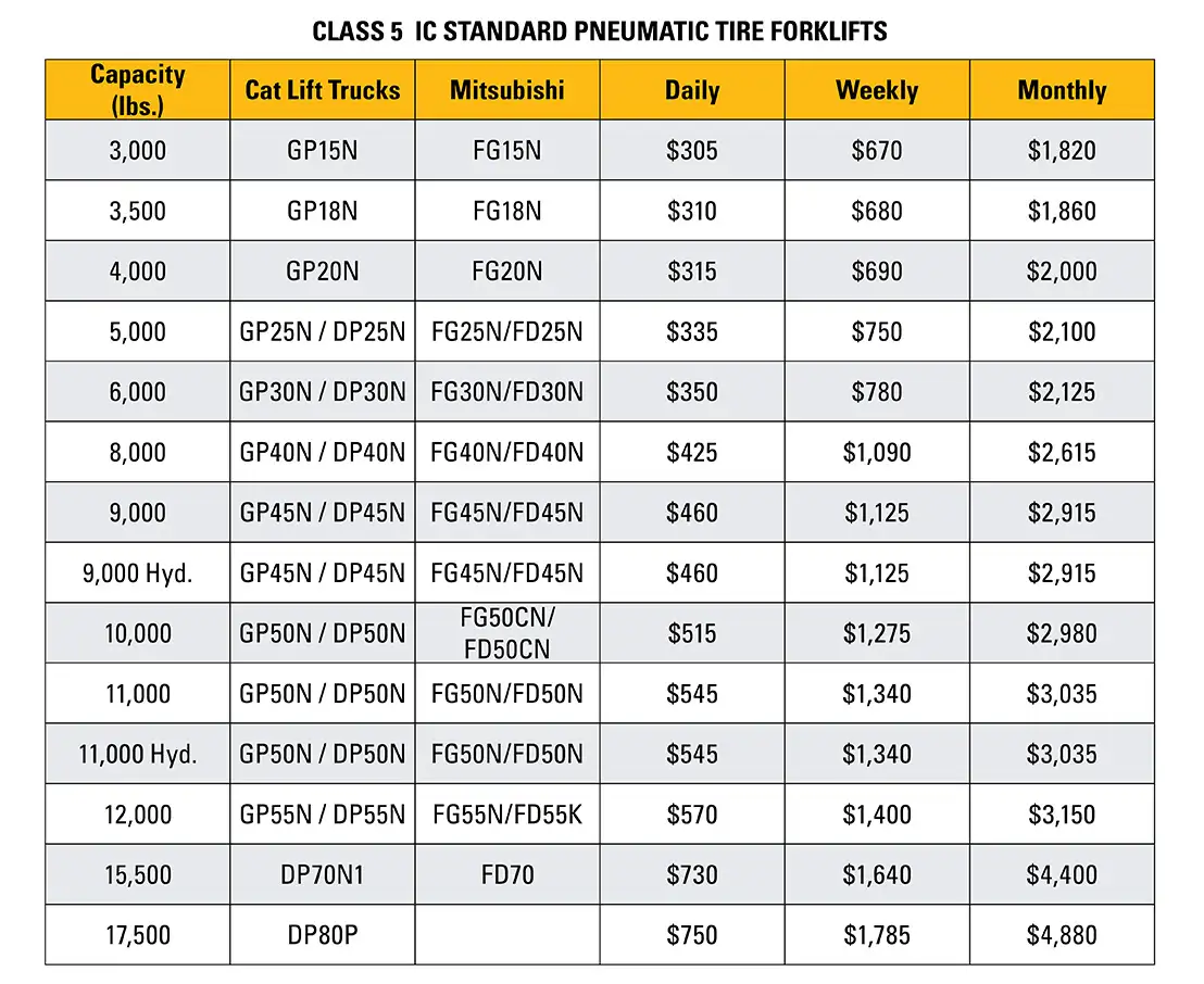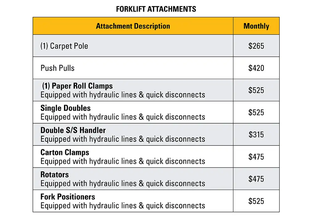 For instance, renting an IC Cushion Tire Forklift running on LP gas will cost you $240 for a daily rental, $500 for a weekly term, or $1,350 for a monthly option. According to our monthly rates, attachments range in price from $235 for a carpet pole to $470 for fork positioners.