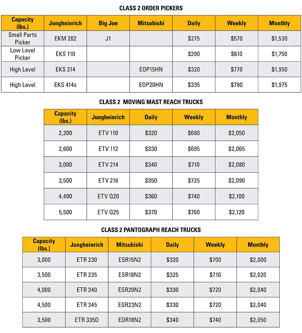 Prices listed in USD. Transport & fuel charges not included. Other fees may apply. Ring Power Lift Trucks does not rent to individuals.